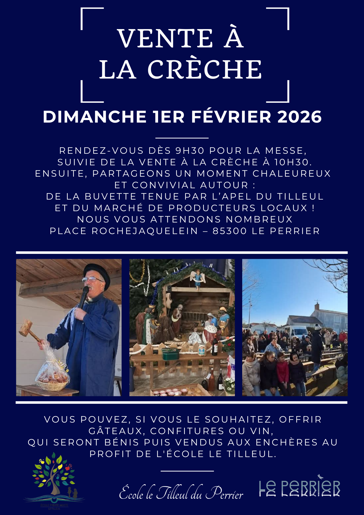 Vous pouvez, si vous le souhaitez, offrir gâteaux, confitures ou vin, qui seront bénis puis vendus aux enchères au profit de l’École Le Tilleul.