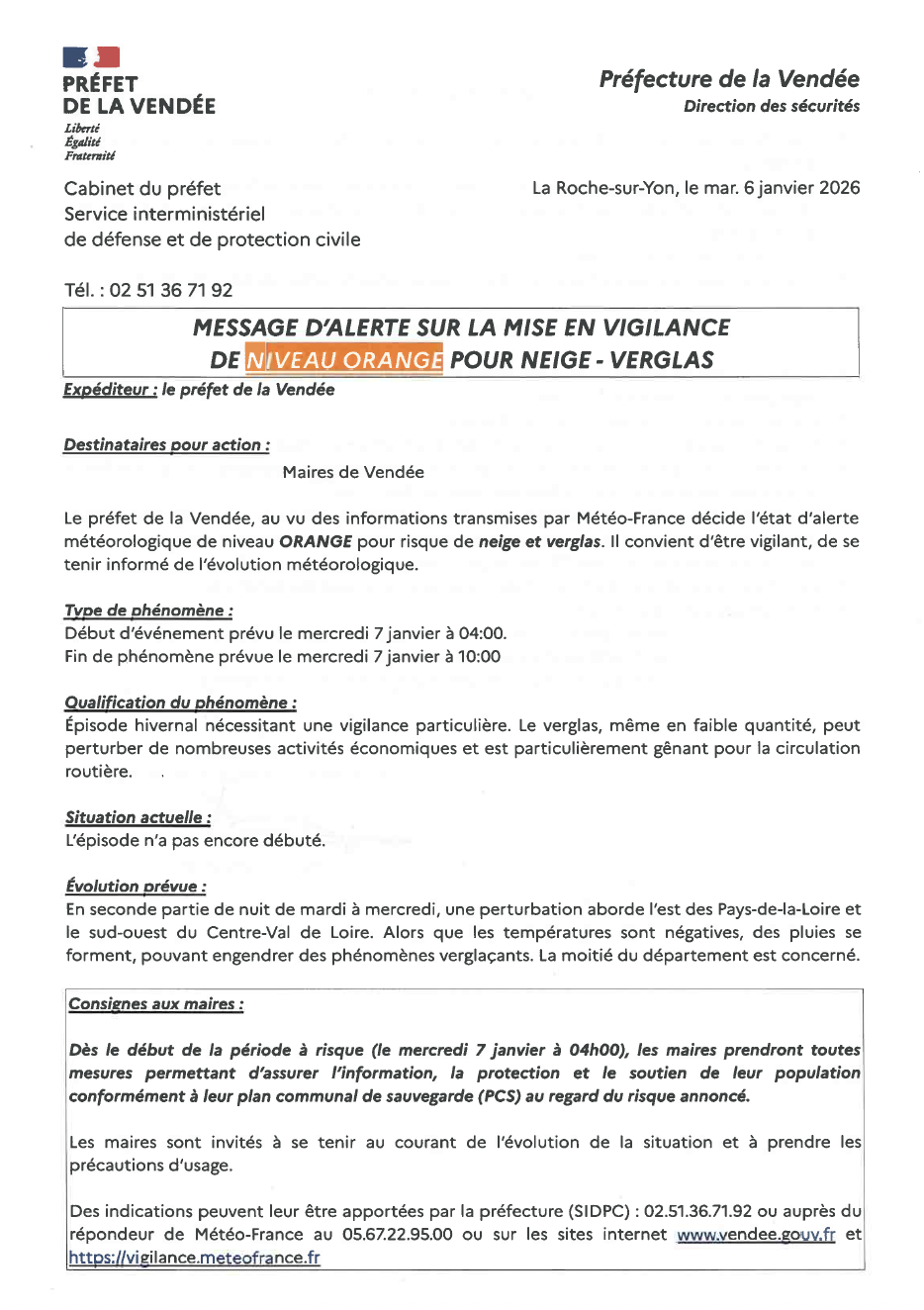 Le préfet de la Vendée, au vu des informations transmises par Météo-France décide l’état d’alerte météorologique de niveau ORANGE pour risque de neige et verglas. Il convient d’être vigilant, de se tenir informé de l’évolution météorologique.