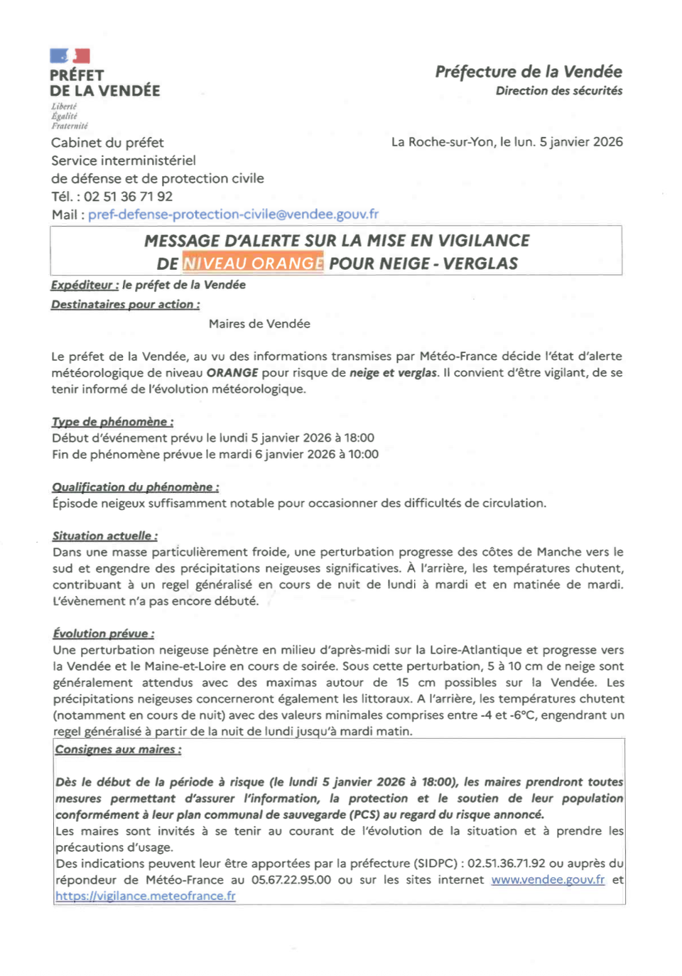 Le préfet de la Vendée, au vu des informations transmises par Météo-France décide l’état d’alerte météorologique de niveau ORANGE pour risque de neige et verglas. Il convient d’être vigilant, de se tenir informé de l’évolution météorologique.