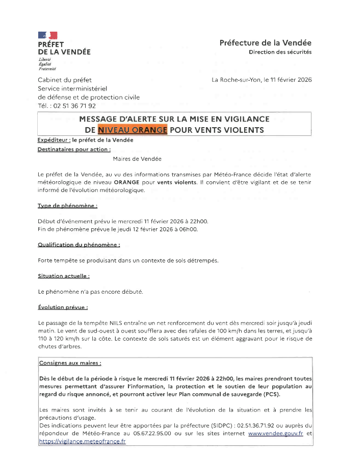 Le préfet de la Vendée, au vu des informations transmises par Météo-France décide l’état d’alerte météorologique de niveau ORANGE pour vents violents. Il convient d’être vigilant et de se tenir informé de l’évolution météorologique.