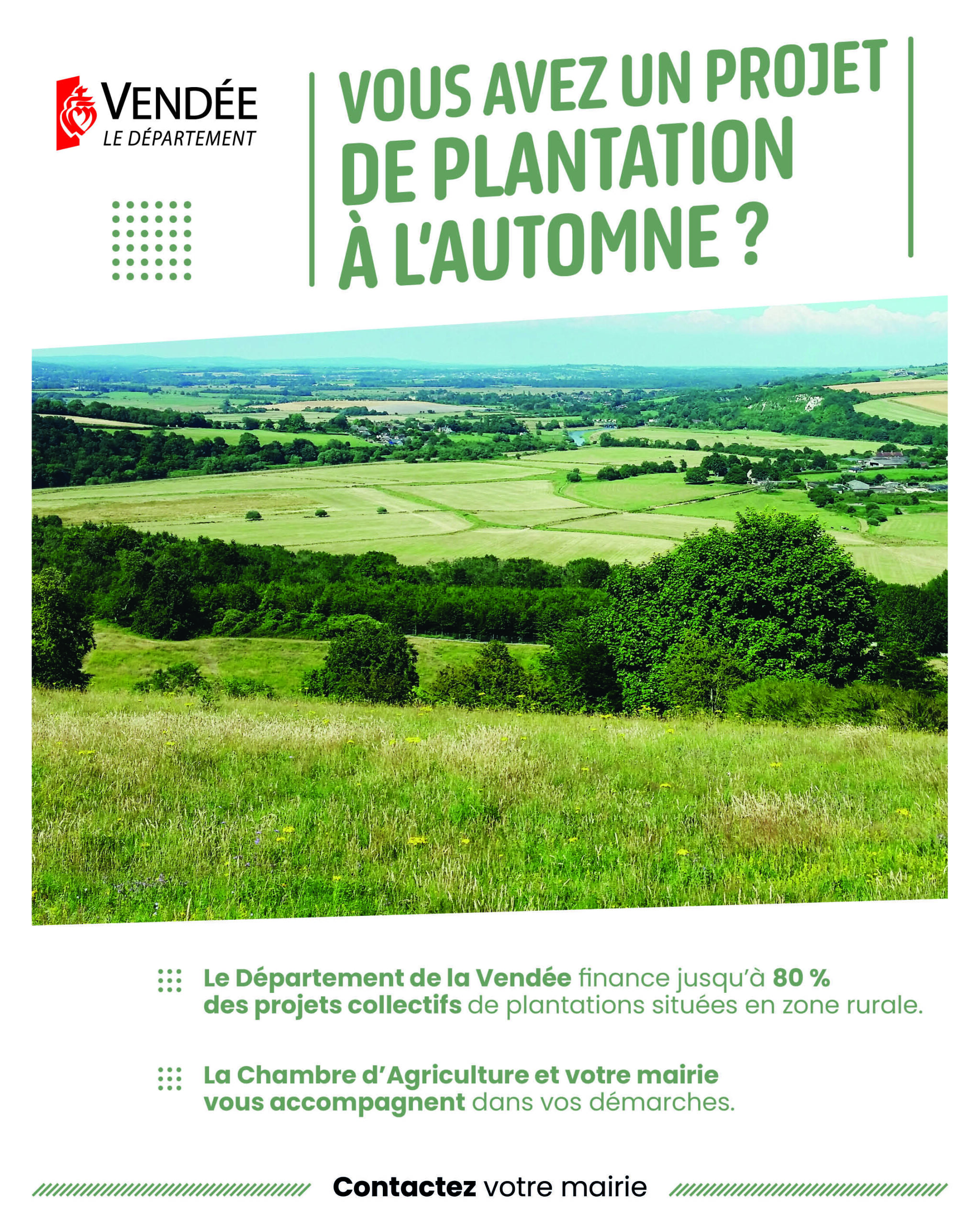 Le Département de la Vendée accorde des subventions aux collectivités pouvant atteindre 80 % des dépenses plafonnées, à condition de porter un projet collectif agricole. Celui-ci doit regrouper des exploitants agricoles et des particuliers, et concerner des plantations situées en zone rurale hors des zones bâties. Les bénéficiaires des plantations n’ont pas de dépenses à engager.